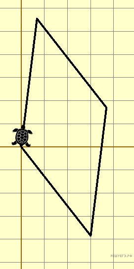 Исполнитель Черепаха действует на плоскости с декартовой системой координат. В начальный момент Черепаха находится в начале координат, её голова направлена вдоль положительного направления оси ординат, хвост опущен. При опущенном хвосте Черепаха оставляет на поле след в виде линии. В каждый конкретный момент известно положение исполнителя и направление его движения. У исполнителя существует 6 команд: Поднять хвост, означающая переход к перемещению без рисования; Опустить хвост, означающая переход в режим рисования; Вперёд n (где n — целое число), вызывающая передвижение Черепахи на n единиц в том направлении, куда указывает её голова; Назад n (где n — целое число), вызывающая передвижение в противоположном голове направлении; Направо m (где m — целое число), вызывающая изменение направления движения на m градусов по часовой стрелке; Налево m (где m — целое число), вызывающая изменение направления движения на m градусов против часовой стрелки.