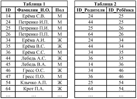 Ниже представлены две таблицы из базы данных. Каждая строка таблицы 2 содержит информацию о ребёнке и об одном из его родителей. Информация представлена значением поля ID в соответствующей строке таблицы 1. Определите на основании приведённых данных фамилию и инициалы дяди Ерёма В. С.