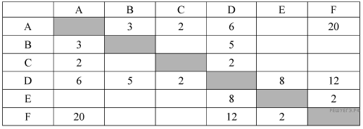 Между населёнными пунк­та­ми А, В, С, D, Е, F по­стро­е­ны до­ро­ги, про­тяжённость ко­то­рых при­ве­де­на в таб­ли­це. (От­сут­ствие числа в таб­ли­це озна­ча­ет, что пря­мой до­ро­ги между пунк­та­ми нет.)