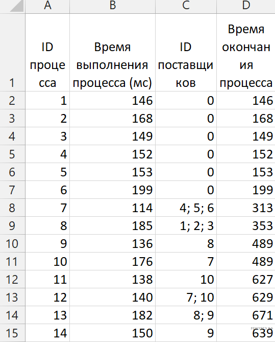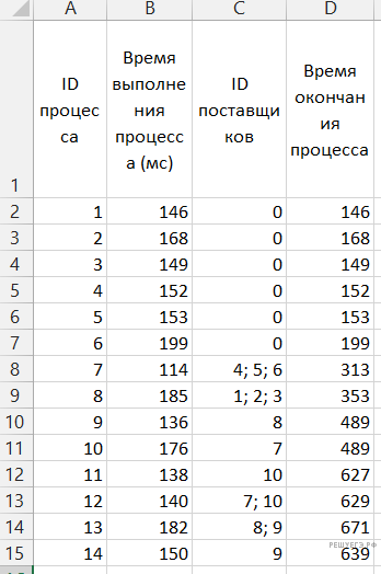 В таблице представлены идентификатор (ID) каждого процесса, его длительность и ID поставщиков данных для зависимых процессов. Для независимых процессов в качестве ID поставщика данных