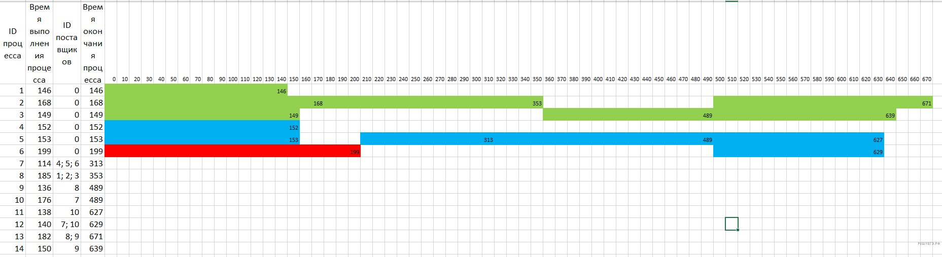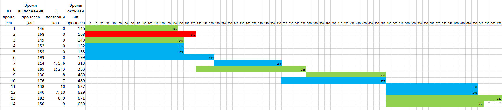 В таблице представлены идентификатор (ID) каждого процесса, его длительность, для зависимых процессов — ID поставщиков данных. Для независимых процессов в качестве ID поставщиков данных