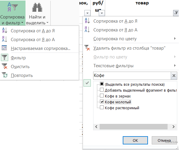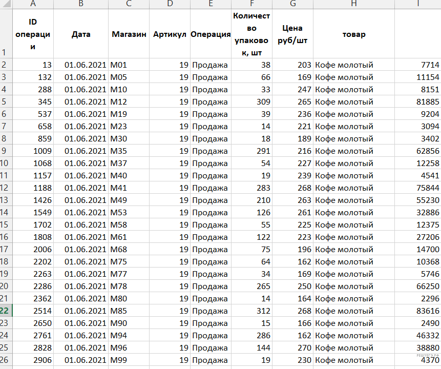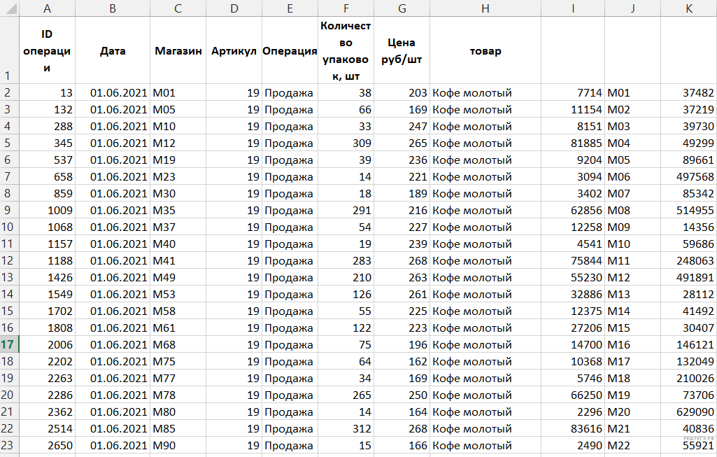 Используя информацию из приведённой базы данных, определите количество магазинов, в которых выручка от продажи кофе молотого за месяц превысила 150 тысяч рублей.
