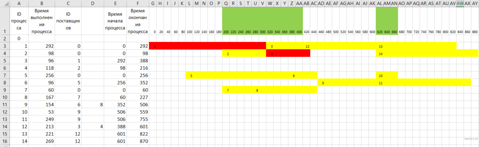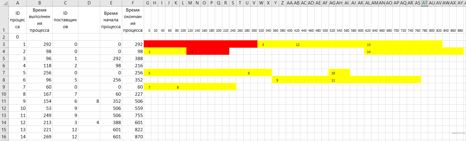 В таблице представлены идентификатор (ID) каждого процесса, его длительность и ID поставщиков данных для зависимых процессов. Для независимых процессов в качестве ID поставщика данных указан 0.