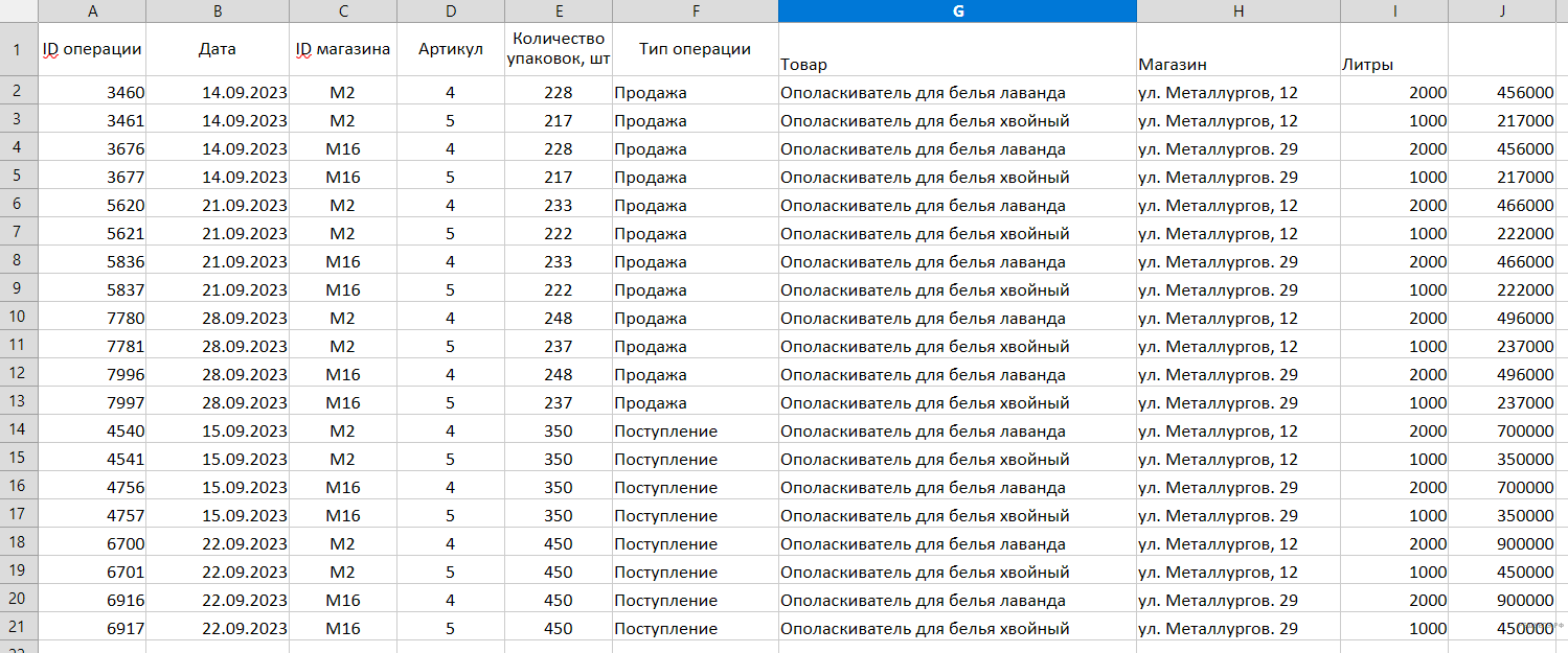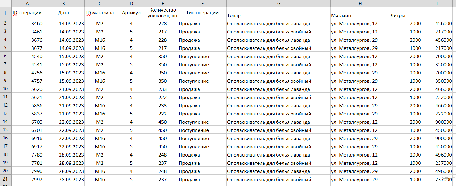 | ID операции | Дата | ID магазина | Артикул | Тип операции | Количество упаковок, шт. | Цена, руб./шт. |