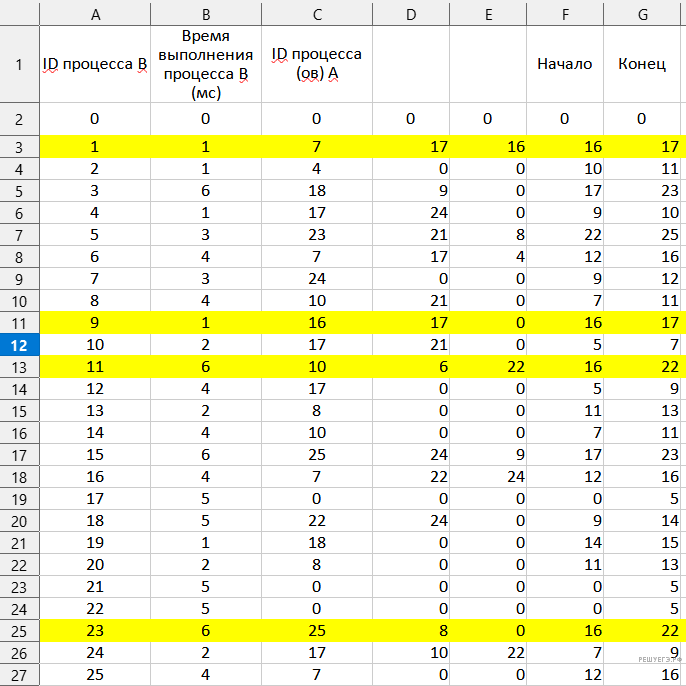 | ID процесса B | Время выполнения процесса B (мс) | ID процесса(-ов) A |
