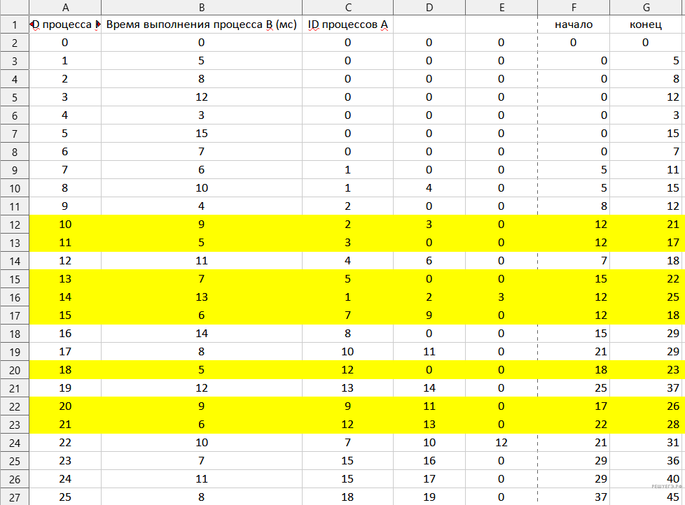 | ID процесса B | Время выполнения процесса B (мс) | ID процесса(-ов) A |