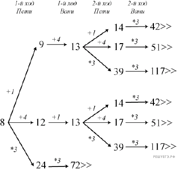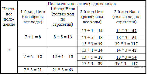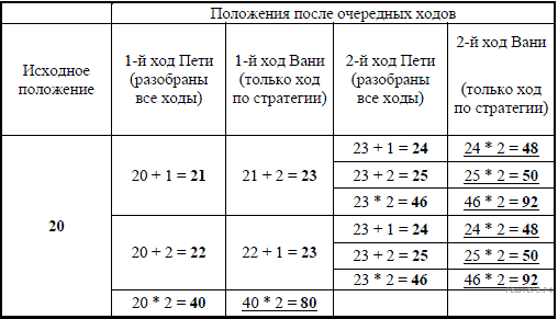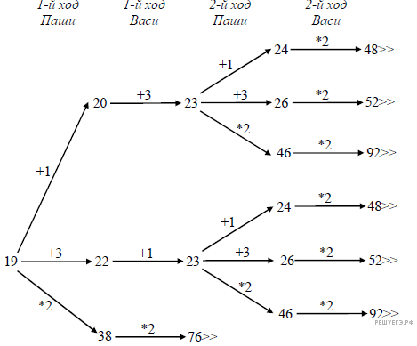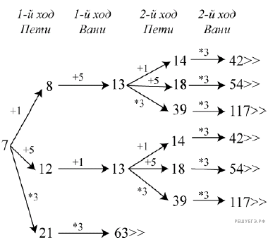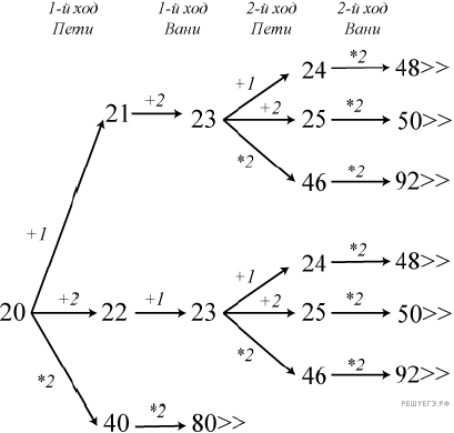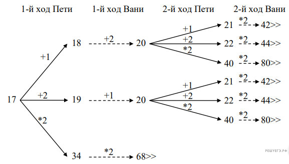 Два игрока, Петя и Ваня, играют в следующую игру. Перед игроками лежит куча камней. Игроки ходят по очереди, первый ход делает Петя. За один ход игрок может добавить в кучу один или два камня или увеличить количество камней в куче в два раза. Например, имея кучу из 15 камней, за один ход можно получить кучу из 16, 17 или 30 камней. У каждого игрока, чтобы делать ходы, есть неограниченное количество камней.