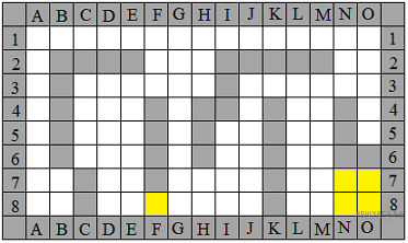 Исполнитель МАШИНКА «живет» в ограниченном прямоугольном лабиринте на клетчатой плоскости, изображенном на рисунке. Серые клетки — возведенные стены, светлые — свободные клетки, по которым МАШИНКА может свободно передвигаться. По краю поля лабиринта также стоит возведенная стенка с нанесенными номерами и буквами для идентификации клеток в лабиринте.