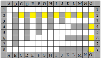 Исполнитель КОРАБЛИК «живет» в ограниченном прямоугольном водоеме-лабиринте, разделенном на клетки и изображенном на рисунке (вид сверху). Серые клетки — скалистые берега, светлые — свободное пространство, безопасное для передвижения КОРАБЛИКА. По краю водоема-лабиринта также находятся скалы с нанесенными на них номерами и буквами для удобства идентификации клеток.