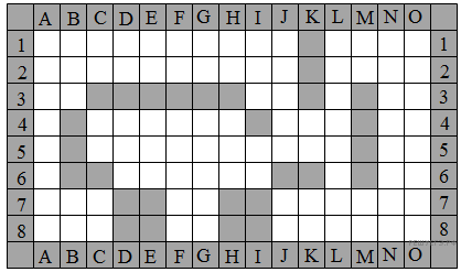 Исполнитель КОРАБЛИК «живет» в ограниченном прямоугольном водоеме-лабиринте, разделенном на клетки и изображенном на рисунке (вид сверху). Серые клетки — скалистые берега, светлые — свободное пространство, безопасное для передвижения КОРАБЛИКА. По краю водоема-лабиринта также находятся скалы с нанесенными на них номерами и буквами для удобства идентификации клеток.