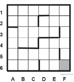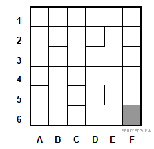 Сколько клеток лабиринта соответствуют требованию, что, начав движение в ней и выполнив предложенную программу, РОБОТ уцелеет (не врежется в стену) и остановится в закрашенной клетке (клетка F6)?