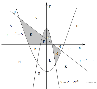 | Область | Условие 1 (у >= 1-x) | Условие 2 (y <= 2−2*x*x) | Условие 3 (y >= x*x−5) | Вывод | Верно |