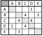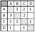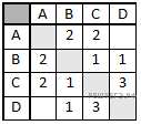 В таблице приведена стоимость перевозки грузов между соседними станциями. Если пересечение строки и столбца пусто, то соответствующие станции не являются соседними. Укажите таблицу, для которой выполняется условие «Минимальная стоимость перевозки грузов от пункта А до пункта В не больше 3».