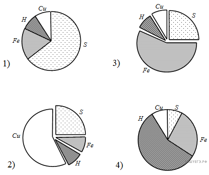 Сплавляются два вещества, состоящие из серы, железа, водорода и меди. Массовые доли серы (S), железа (Fe), водорода (Н) и меди (Си) в каждом веществе приведены на диаграммах.