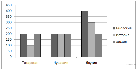 Какая из диаграмм правильно отражает соотношение общего количества участников (из всех трех регионов) по каждому из предметов тестирования?